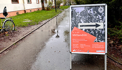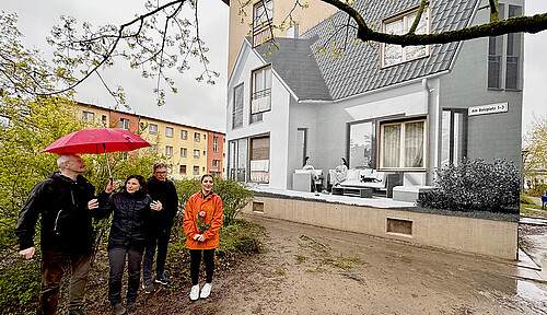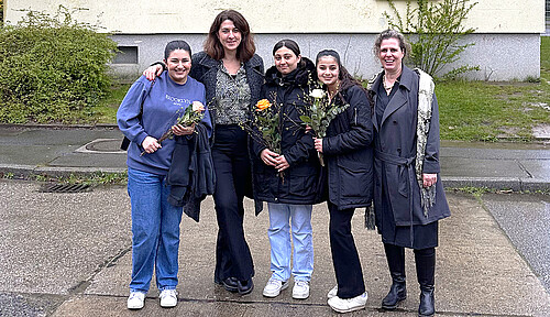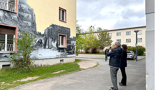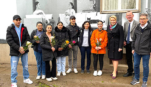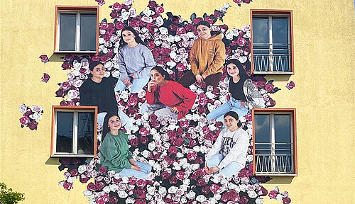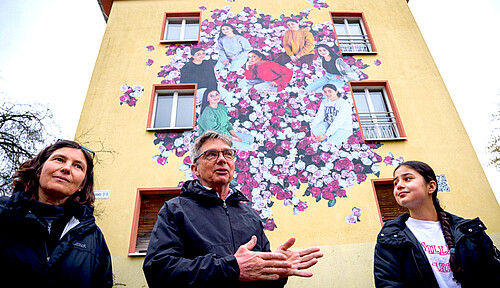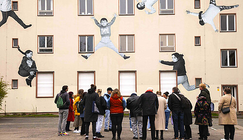 Gemeinsam mit Jugendlichen, die im Wohnheim Marienfelde leben, hat das Künstlerpaar Maria Vill und David Mannstein Paste-Ups gestaltet. Das sind haushohe und zudem höchst beeindruckende Bilder, die aufwendig an die Gebäudefassaden des Notaufnahmelagers geklebt wurden. Bei der Premierenführung u.a. mit Franziska Giffey berichteten die Macher*innen von dem Entstehungsprozess der Bilder und der darin verarbeiteten Auseinandersetzung mit diesem Ort, der bis heute ein Ort des Ankommens ist. Die großflächigen Motive zeigen auf sehr besondere Weise, was die jungen Menschen bewegt – sie machen Verlust und Schwere ebenso sichtbar wie die Hoffnung auf eine leichtere Zukunft, den Wunsch nach einem freien, selbstbestimmten Leben.