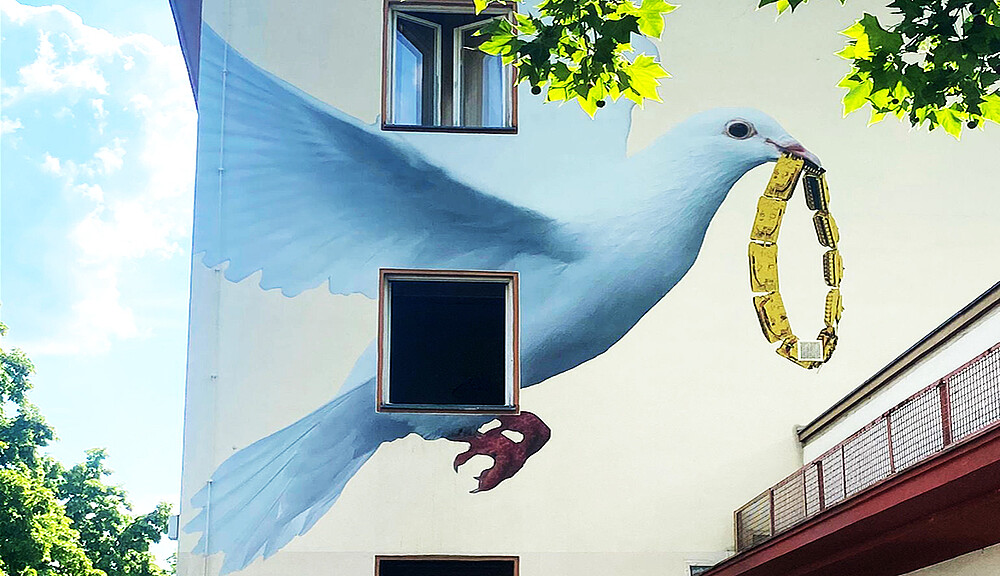 Eine Taube mit einem goldenen Ring im Schnabel. Kein Ring. Was da glänzt, ist nicht schön, es sind Leopard 2 Panzer. Aber die Taube steht für Freiheit und Frieden. Die Taube ist dafür da, dass wir Frieden und Freiheit erleben können, weil wir jetzt in Deutschland sind. Hier können wir so vieles machen. In unserer Heimat ist Krieg, wir können nicht frei leben und nichts machen. Die Taube will uns helfen, sie versucht, mit den Panzern im Schnabel weg zufliegen, damit kein Krieg mehr ist. Aya Ossi