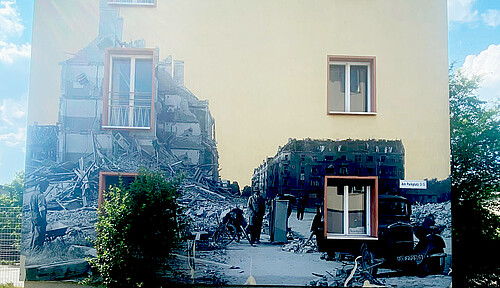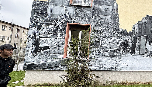 Das ist ein Bild von der Schillingstraße in Reinickendorf im Juli 1944. Im zweiten Weltkrieg wurde die Straße bei einem Luftangriff getroffen und man sieht, das alles kaputt gegangen ist. Die Menschen haben aber nicht aufgegeben und viele haben sich zusammengetan. Gemeinsam haben sie viele Teile der Entrümmerung gesammelt und damit Berlin wieder aufgebaut. Auch ein Teil von diesem Heim hier in Marienfelde, wo ich jetzt wohne, wurde von diesen Steinen gebaut. Also das zeigt, auch wenn alles kaputt ist, geht das Leben weiter und wir können uns eine Zukunft aufbauen. Sheikho