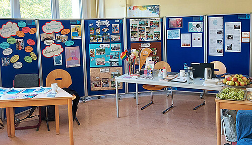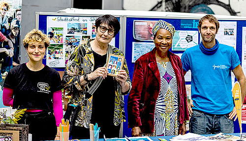 Am Infostand des Jugendmigrationsdienstes oben im Bild von links nach rechts: Marie Kauer - JMD Mental Health Coaches, Susanne Christopoulos - Regionalleiterin des IB Berlin-Brandenburg / Potsdam sowie Koko N'Diabi Affo-Tenin und Stephan Schneider beide JMD Respekt Coaches.