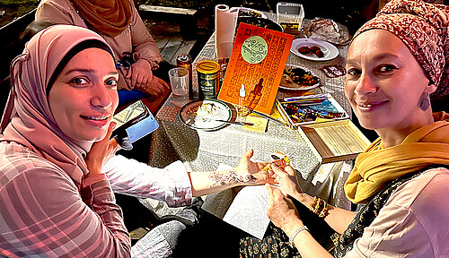 Interkulturelle Begegnungen pflegen und feiern – allen Rückschlägen zum Trotz: In diesem Zeichen stand der darauf folgende Freitagnachmittag und -abend. Wie schon im vergangenen Jahr luden wir im Rahmen der Interkulturellen Woche, die bundesweit unter dem Motto #NeueRäume stattfand, in das Kunst- und Kreativzentrum Rechenzentrum Potsdam ein. Ab 16 Uhr erwartete die Besucher*innen ein buntes Programm mit Livemusik, einer Ausstellung, Textildruck, Henna-Bemalung und einem internationalen Buffet. Zugleich schuf die Bilderausstellung der jungen Künstlerin Doaa Bashir Al-Nashi einen ganz eigenen stillen Raum für die Fragen nach dem „Wer bin ich, wer kann und darf ich sein?“ An Infoständen zu unseren Projekten konnten die Gäste – vor allem Kooperationspartner*innen des JMD, zum Beispiel von der Jugendberufsagentur, Jugendtreffs, Begegnungszentren und Schulen – mit uns JMD-Mitarbeitenden ins Gespräch kommen.